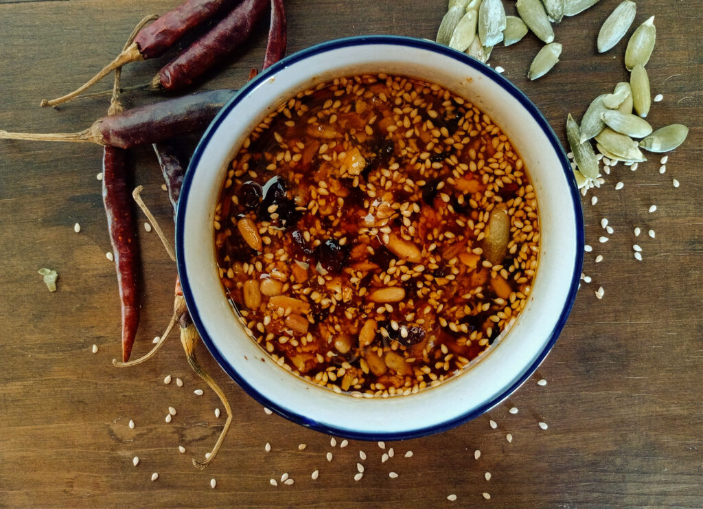 €20La salsa macha es puro fuego con sabor: aceite bien caliente con chiles secos, ajo y semillas, picosita, crujiente y tan buena que levanta hasta un taco triste.